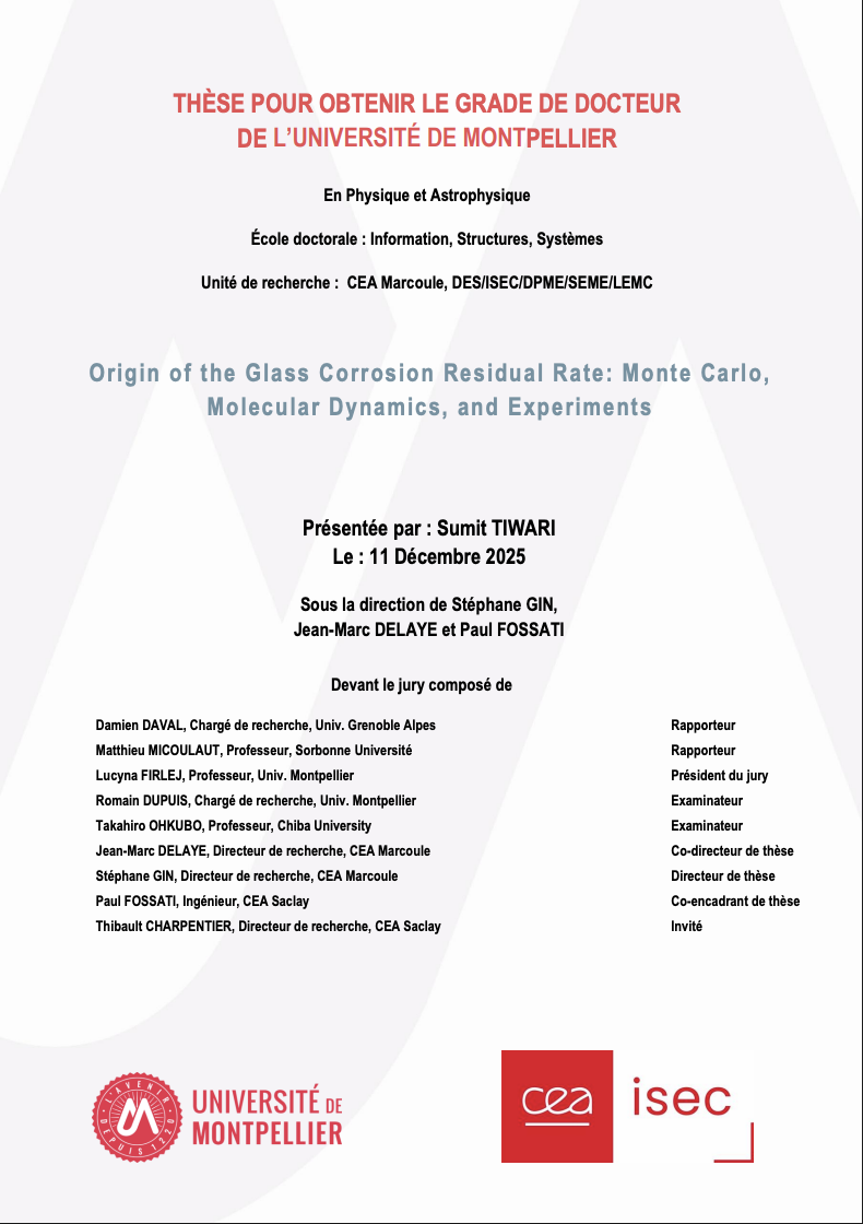L’altération par l’eau du verre est un sujet d’importance centrale, avec des applications en microélectronique, dans le domaine de la santé (verres bioactifs), pour l’isolation des bâtiments (laines de verre ou laines de roches) ou encore pour le conditionnement des déchets nucléaires à vie longue. Pour ces derniers, des verres borosilicatés contenant plus de 30 oxydes sont développés et produits depuis plus d’une trentaine d’années en France. La durabilité chimique de ces verres peut être étudiée à l’aide de verres modèles simplifiés. Comprendre les processus qui gouvernent leur altération, et en particulier la transition vers le régime de vitesse résiduelle, est essentiel pour prédire les performances de ces matériaux à long terme. Dans cette thèse, l’altération du verre est étudiée en suivant trois axes complémentaires : des expériences, la modélisation de type Monte Carlo et des simulations de dynamique moléculaire. Les expériences conduites sur trois verres de type SBNA (SiO2 – B2O3 – Na2O – Al2O3), présentant des teneurs variables en Al2O3, montrent que l’aluminium contrôle la vitesse de réorganisation du gel, laquelle détermine l’efficacité de la passivation et donc la vitesse résiduelle. Des simulations Monte Carlo ont été utilisées pour décrire la maturation du gel et établir comment l’évolution temporelle de la morphologie de ces couches est corrélée à la diminution de la diffusivité des ions observée expérimentalement. Cette corrélation fournit une explication mécanistique de la formation de couches d’altération à faible diffusivité et de leur contribution à la passivation à long terme. À l’échelle atomique, des simulations de dynamique moléculaire ont permis d’examiner la diffusion du bore au sein de gels modèles. Un champ de force dédié, basé sur des potentiels réactifs à charges diffuses, a été développé pour le bore en solution dans des pores de silice au moyen d’une procédure d’ajustement des forces à partir de données ab initio. Ces calculs montrent que les environnements locaux et la structure des pores gouvernent la mobilité du bore, fournissant ainsi une explication microscopique à la rétention variable de cet élément dans les gels d’altération. Pris dans leur ensemble, les trois approches convergent vers une vision unifiée : la concentration en aluminium gouverne la dynamique de restructuration du gel, la maturation du gel est directement liée à la diminution de la diffusivité des ions au cours du temps, et les interactions à l’échelle atomique déterminent la mobilité d’espèces clés telles que le bore. Cette approche multi-échelles fait progresser notre compréhension de l’altération du verre dans le régime résiduel et offre une base prédictive plus solide pour décrire la stabilité à long terme des verres de confinement des déchets nucléaires.