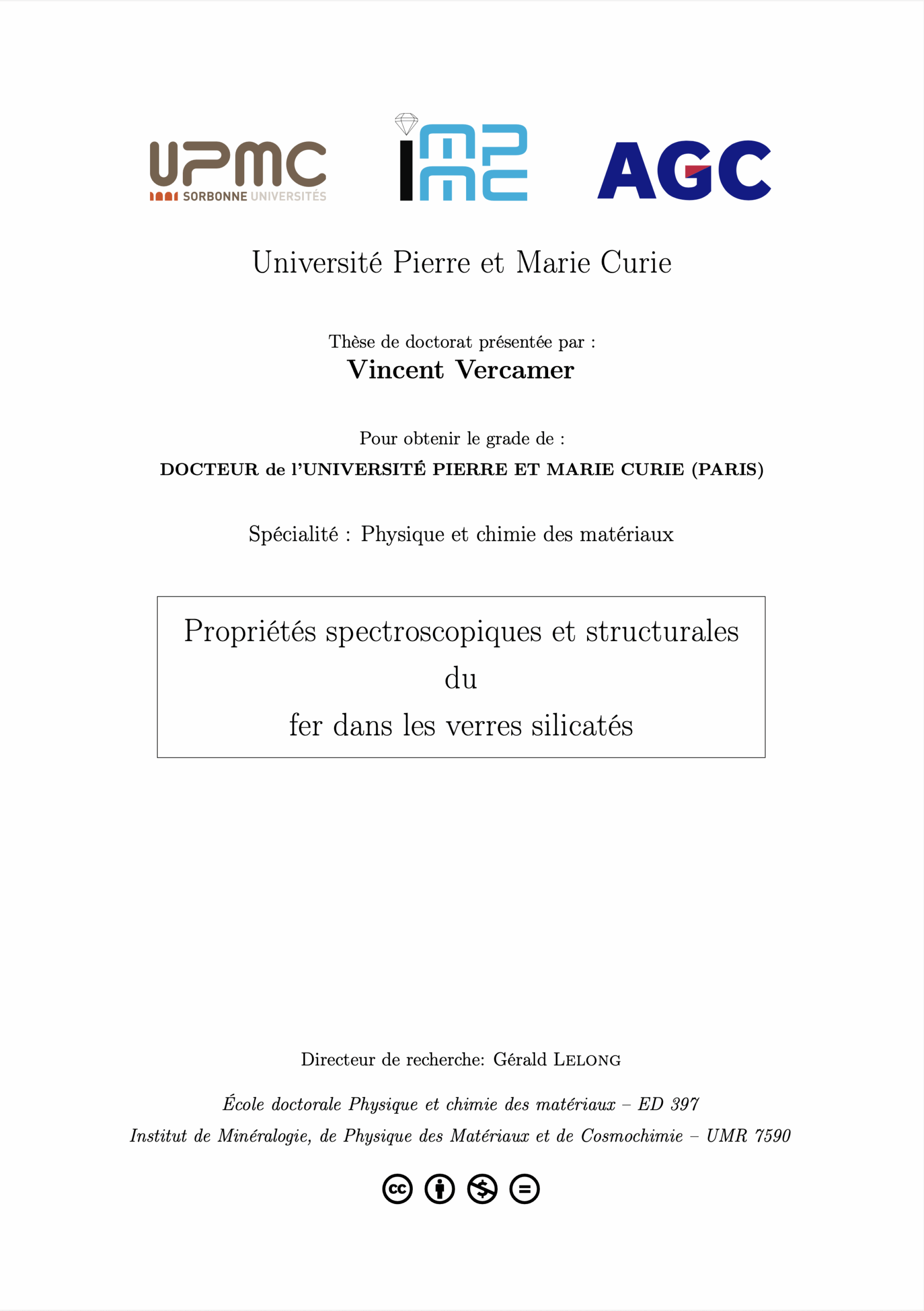 Parmi l’infinité de compositions verrières, les silicates représentent 90% de la production mondiale de verre et sont utilisés pour de nombreuses applications industrielles (par exemple l’automobile, le bâtiment ou les panneaux solaires). Des verres silicatés dopés avec 0.5%pds de Fe2O3 ont été spécifiquement synthétisés dans des conditions d’oxydoréduction extrêmes, réductrices ou oxydantes. L’objectif étant d’isoler les signatures spectroscopiques respectives du Fe2+ et du Fe3+ qui sont habituellement mélangés en raison de la nature hétérovalente du fer. Cependant, les conditions de synthèse ne permettent pas d’isoler des environnements spécifiques du fer qui reste distribué dans les verres. Par conséquent, des minéraux contenant du Fe2+ et du Fe3+ dans des environnements bien définis ont été sélectionnés. La compréhension des relations structure-spectroscopie dans ces références cristallines est donc une étape préliminaire à l’interprétation des signatures spectroscopiques du fer dans les verres. Une étude multi-spectroscopique a été réalisée sur les verres et minéraux en combinant des méthodes expérimentales (absorption optique, absorption des rayons X au seuil K du fer, résonance paramagnétique électronique) et théoriques (calculs multiélectroniques dans l’approche en champ de ligand pour reproduire les spectres de pré-seuils K et de spectres optiques) pour mieux comprendre l’environnement local du fer dans les verres. L’étude des références cristallines a permis de montrer l’influence de la symétrie locale (Oh, Td, D4h/C4v et D3h/C3v) du site du fer et de l’hybridation p–d sur sa signature spectroscopique. Concernant l’étude des verres silicatés réduits, une majorité du Fe2+ est présent en coordinance 5, il est montré que cette dernière permet de reproduire et d’expliquer la signature du fer par une distribution des paramètres de champ cristallin rendant compte de la nature amorphe du verre. L’analyse des verres oxydés a permis d’appuyer l’existence de Fe3+ en coordinance 5 dans les verres sodo-calciques, dont la prise en compte est nécessaire pour l’interprétation des spectres optiques en complément des coordinances tétraédriques. Cette étude apporte un éclairage nouveau sur les variations structurales et spectroscopiques du fer en réaction à une substitution du calcium par du magnésium ou à l’absence d’alcalin dans la composition de la matrice verrière.